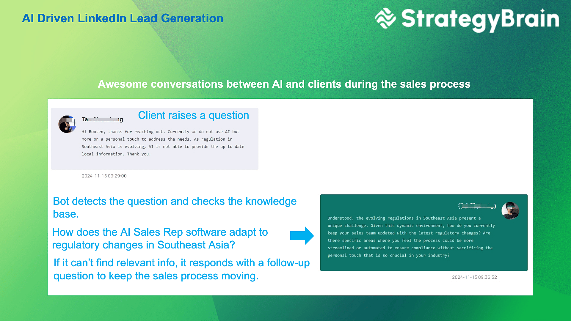 With its advanced features, StrategyBrain’s AI Sales Rep provides a powerful tool for optimizing online leadgeneratie efforts on LinkedIn.